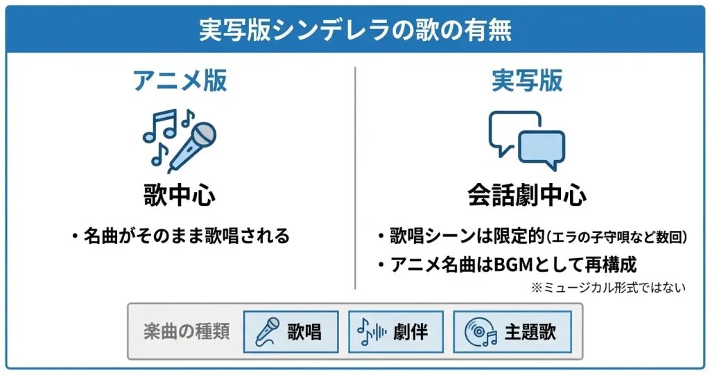 アニメ版では「ビビディ・バビディ・ブー」や「夢はひそかに」といった楽曲がストーリーの重要な場面で歌われます。しかし実写版ではこれらの楽曲は歌唱ではなく劇伴(BGM)として再構成されています。
