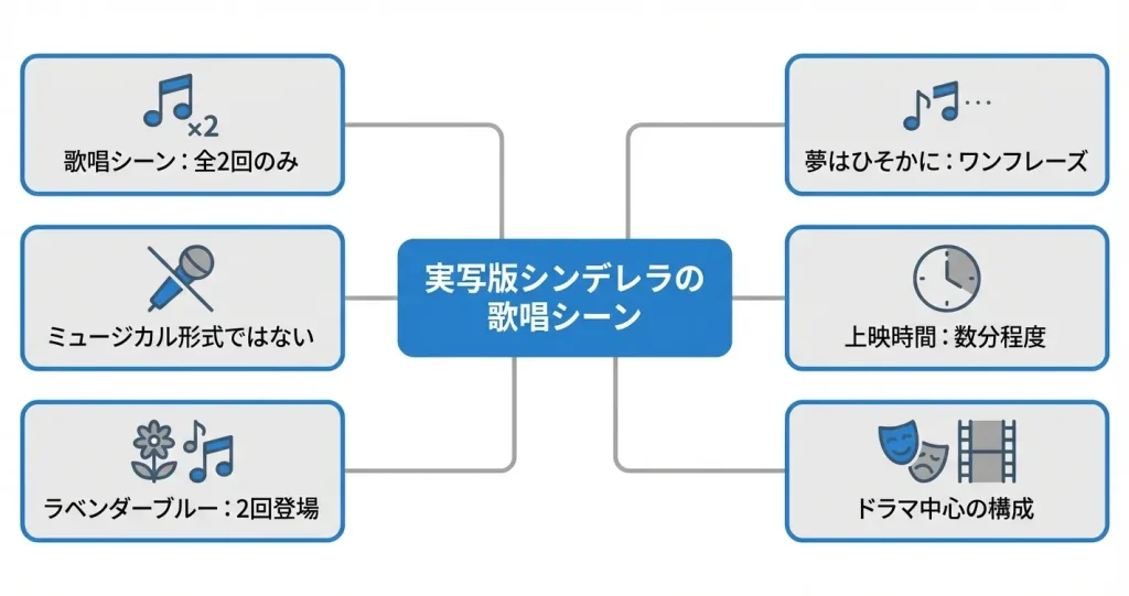 実写版シンデレラには歌唱シーンがあります。ただし、ミュージカル映画のように全編を通して登場人物が歌い続ける作風ではありません。