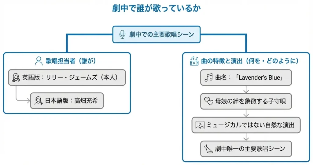一つ目はエラが劇中で実際に歌う「Lavender’s Blue」で、これは物語の自然な流れの中で挿入されます。