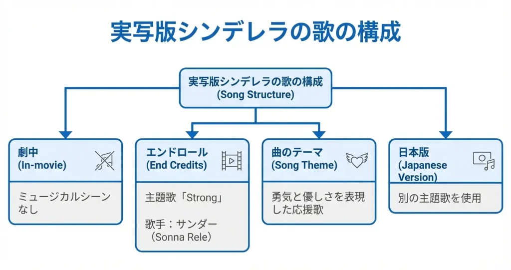実写版シンデレラでは、アニメ版のような本格的なミュージカル形式は採用されていませんが、劇中で歌唱シーンが存在します。