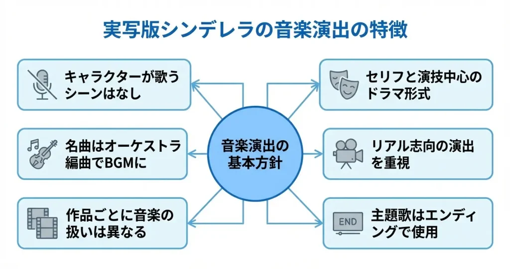 実写版シンデレラの場合、アニメ版で親しまれた「夢はひそかに」や「ビビディ・バビディ・ブー」といった楽曲は、歌詞付きの歌唱シーンとしてではなく、オーケストラによる演奏でシーンを彩るBGMとして使用されています。
