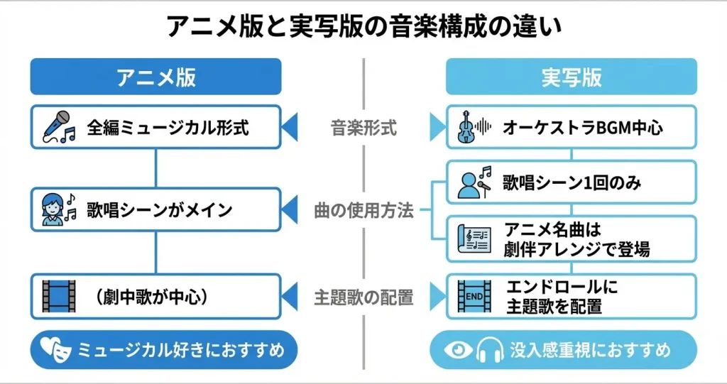 アニメ版との大きな違いを理解しておくことで、視聴前の期待値を適切に設定できます。このセクションでは、実写版における歌の使われ方と、アニメ版との主な相違点を整理します。