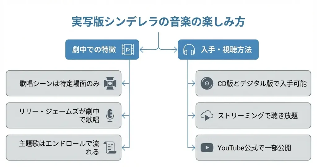 実写版シンデレラの音楽は、サウンドトラック購入や配信サービスを通じて、視聴環境に応じた形式で楽しめます