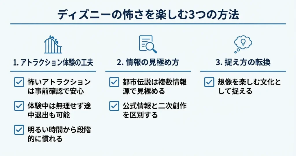 このセクションでは、代表的な怖い話や都市伝説の具体例から、アトラクション体験時の心構え、情報判断の方法まで、ディズニーの怖さを健全に楽しむための実践的な指針を紹介します。