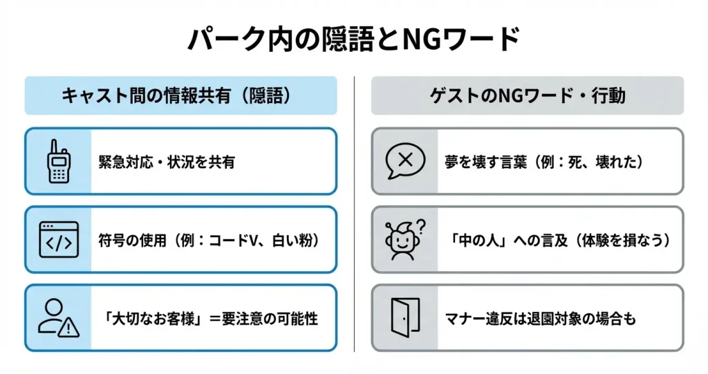 ディズニーパークでは、来園者には見えない独自の用語体系がキャスト間で運用されています。この隠語システムは、ゲストに夢を壊さずに円滑な運営を維持するために設計されたものであり、一部はゲスト側が知っておくべきマナーやルールにも関わります。