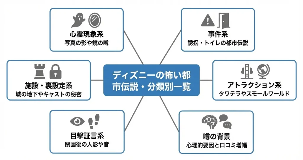 ここまでパーク内の隠語やマナーといった「裏側」の世界を見てきましたが、ディズニーには他にも数多くの不思議な都市伝説が存在します。次のセクションでは、真偽不明ながら語り継がれる噂や謎について、まとめて紹介します。